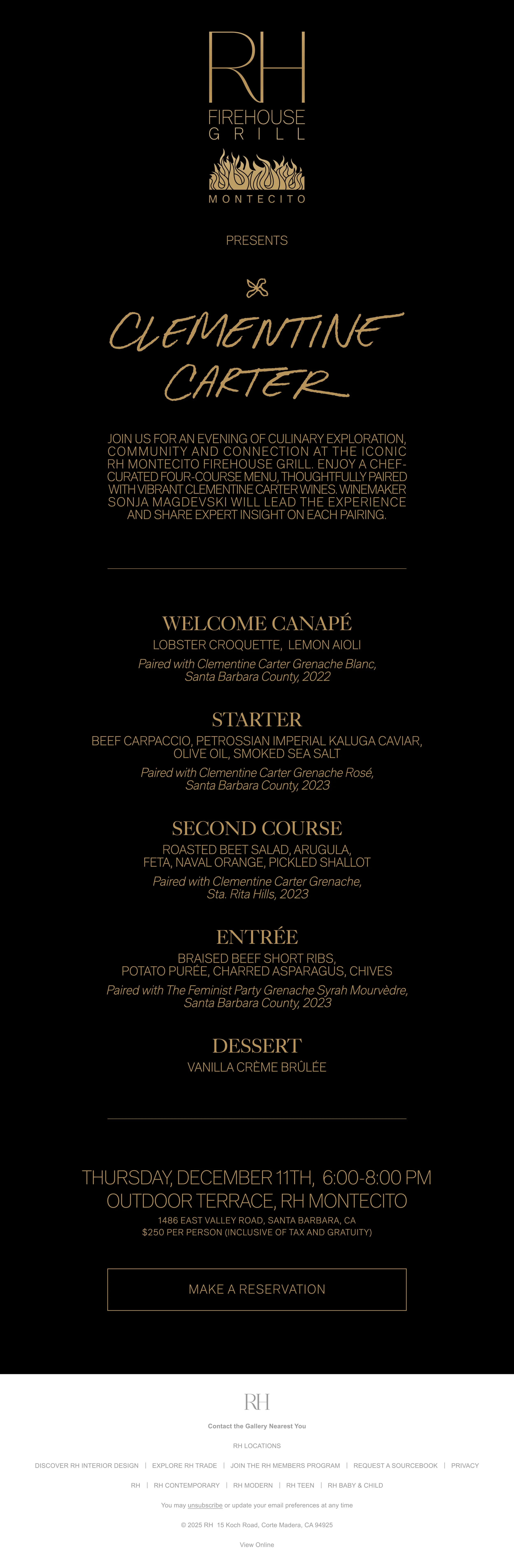 Join us for a fabulously curated intimate dinner at RH Montecito in the upper village.